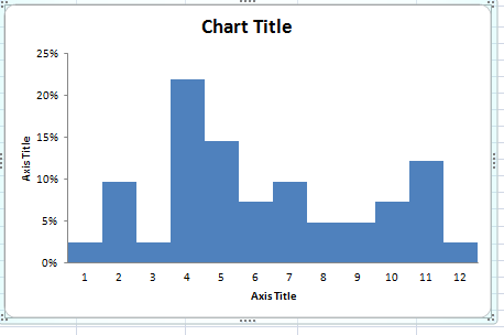 Onze grafiek gelijkt al sterk op een histogram zoals we dat gewoon zijn. Hij is echter nog moeilijk te lezen omdat er geen kaders om de afzonderlijke blokken zitten.