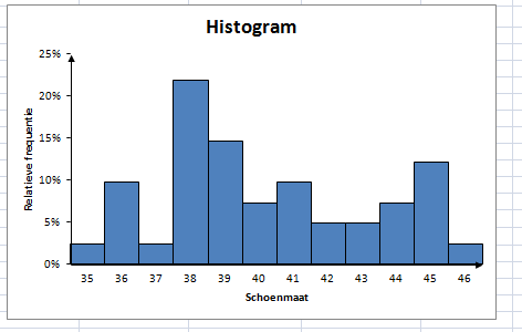 Er staat simpelweg dat de 1e geselecteerde waarde ongeveer 2% van de totale waarnemingen beslaat. Je hebt excel namelijk nog niet duidelijk gemaakt dat de eerste waarde overeenkomt met schoenmaat 35, de 2de waarde met schoenmaat 26 en zo voorts.