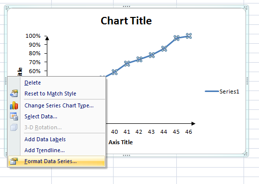 Je grafiek is bijna compleet. Er moeten enkel merktekens gezet worden op de punten. Selecteer daarom de lijn van je grafiek en kies voor de optie ‘Format data series’.